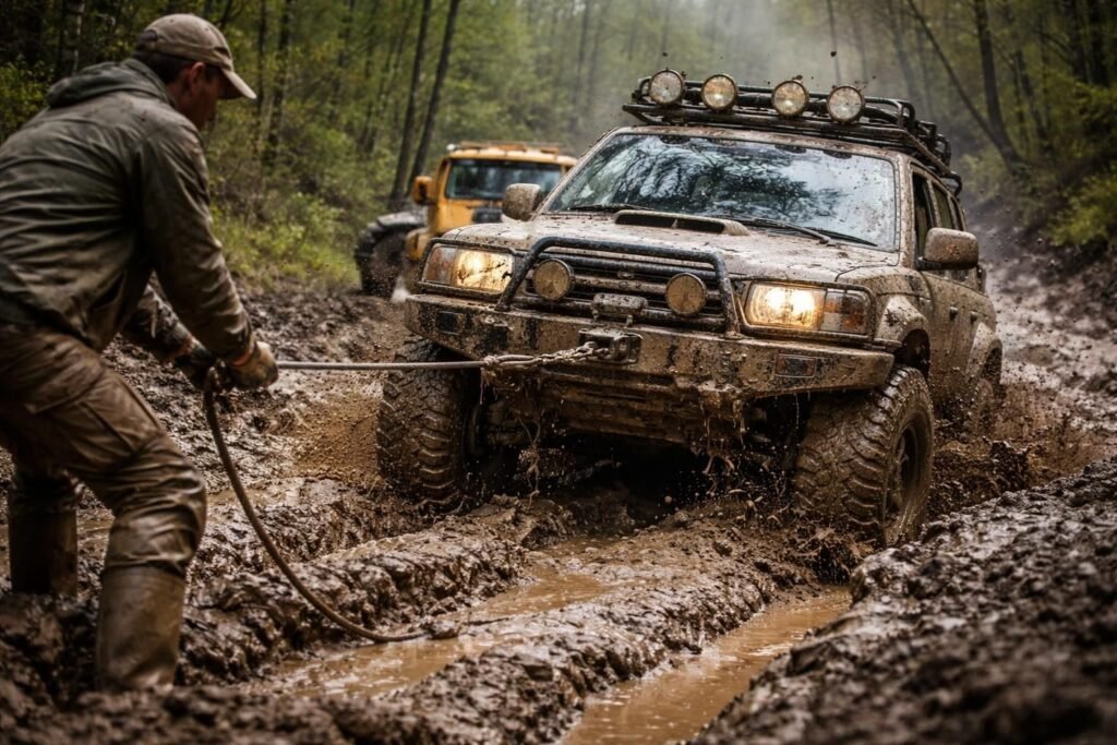 • Utiliser le mouflage : en divisant la charge par 2 via une poulie, le treuil consomme environ 2,5× moins d’énergie (gain de rendement lié au couple plus faible). Indispensable pour les grosses récupérations — apprenez la technique dans notre guide du mouflage